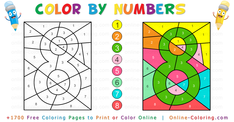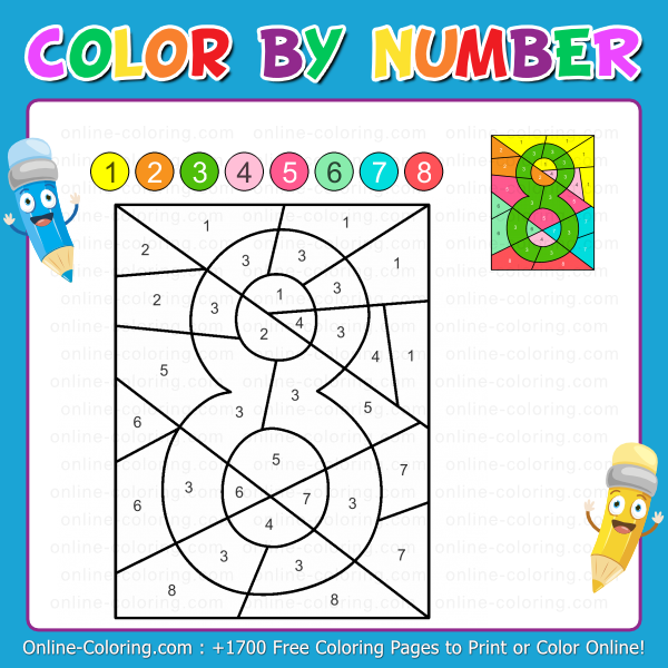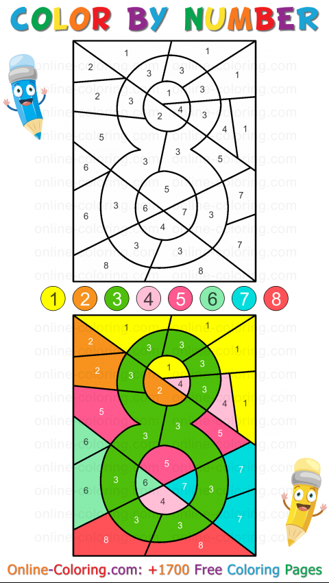 In this Color By Number activity, each section of the page contains a number linked to a specific color. By carefully following the color guide, children gradually make the picture clearer and bring the number 8 to life. As more spaces are colored, the design becomes brighter and the shape of the number stands out more and more.