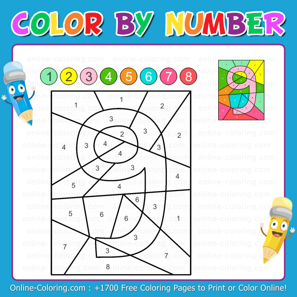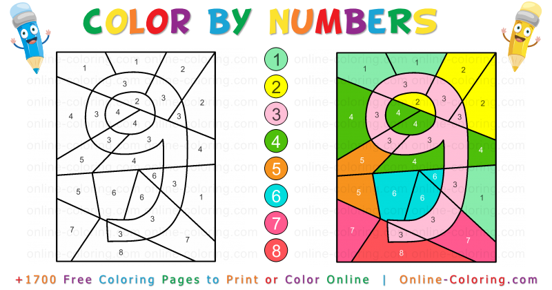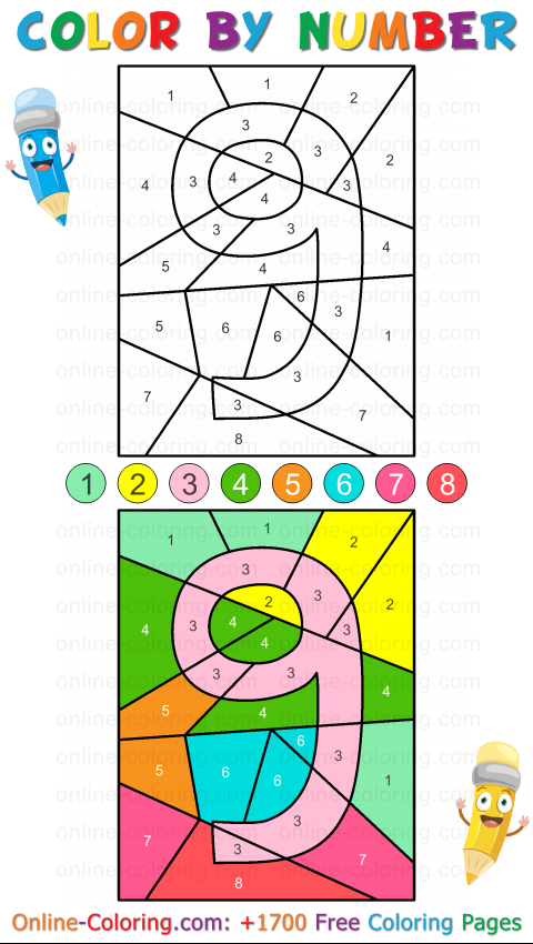 This colorful activity invites children to bring the shape of 9 to life through bright shades and playful numbered areas. At first, the page looks like a cheerful arrangement of sections waiting to be filled, but little by little, a familiar figure begins to stand out. With every correct color added, the elegant curve and rounded top of the number 9 become clearer and more lively.