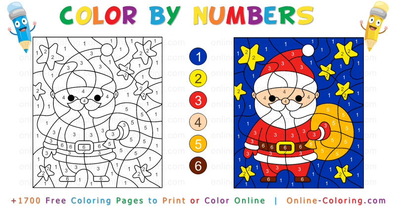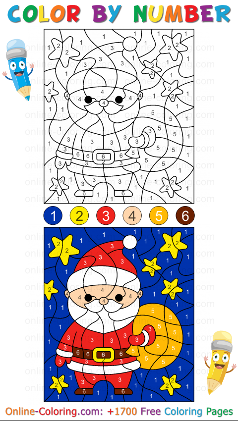 This festive Color By Number Coloring Page invites you to reveal a cheerful Santa Claus just by following the numbers. Each little area has a number, and each number matches a specific color. All you have to do is color the sections one by one to make Santa appear as if by magic! With his bright red suit, sparkling yellow stars, and a big golden gift bag, Santa slowly comes to life while you color. It's the perfect activity if you love fun logic games and creative coloring.