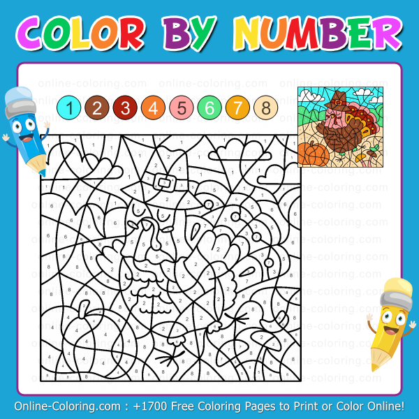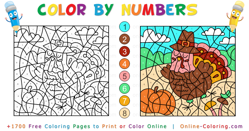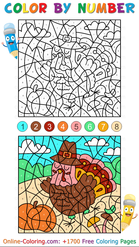 This Color By Number Activity takes children straight into a cheerful autumn landscape, where a proud Thanksgiving turkey walks among pumpkins, golden hills, and swirling leaves. To reveal the entire scene, simply follow the numbers: each area matches a specific color, turning the activity into a playful mix of logic, focus, and discovery. As the numbered spaces fill in one by one, the picture slowly appears, like a bright and colorful puzzle.