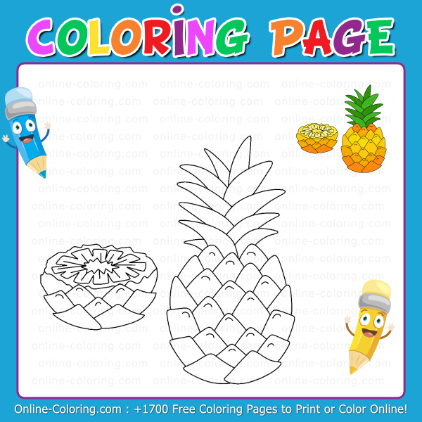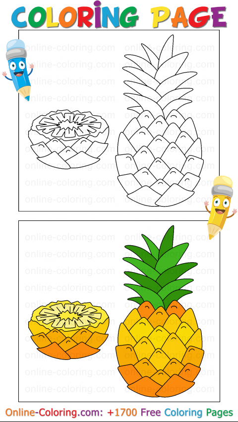 The pineapple, with its crown of pointed leaves and golden-scaled skin, is one of the most recognizable fruits in the world. In this coloring page, it stands tall and proud, accompanied by a sliced ring revealing its bright yellow flesh.