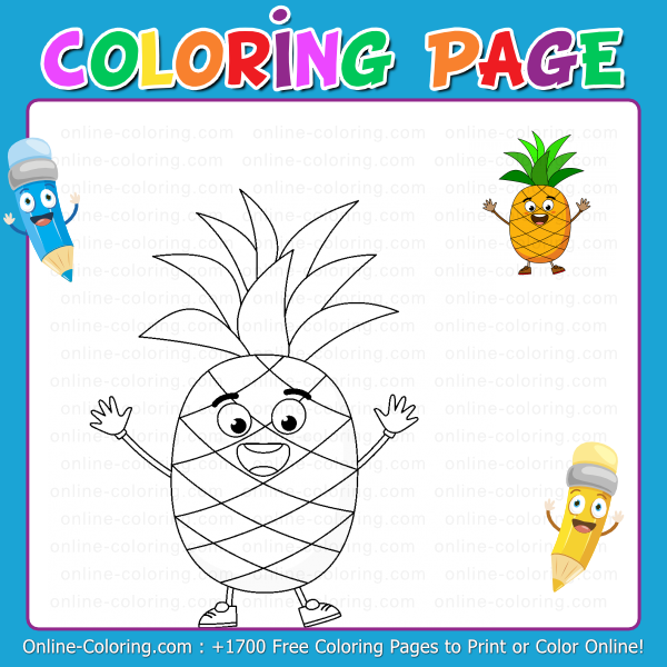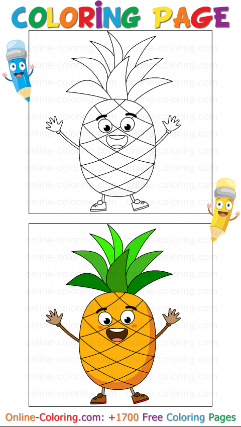 Get ready for a boost of energy and good vibes with this fun pineapple coloring page! The pineapple is a tropical fruit full of sunshine, easily recognized by its oval shape, its skin covered in spiky diamond patterns, and of course, the big green crown of leaves proudly standing on top. It grows close to the ground, right at the center of a low leafy plant, and can take over a year to ripen. Yep, itâs a fruit that takes its time! But when itâs ready, itâs absolutely deliciousâsweet, juicy, and perfect in fruit salads, smoothies⊠or even on pizza (if youâre one of the brave ones!). In some cultures, pineapples are a symbol of hospitality and warmth, and youâll often see them as decorations. But the one youâre about to color isnât here for showâitâs here to dance, pull silly faces, and help you have fun while learning about colors! Look at those raised arms, that big smile, and those little sneakersâit looks like itâs ready for a tropical party.
