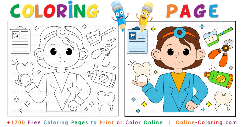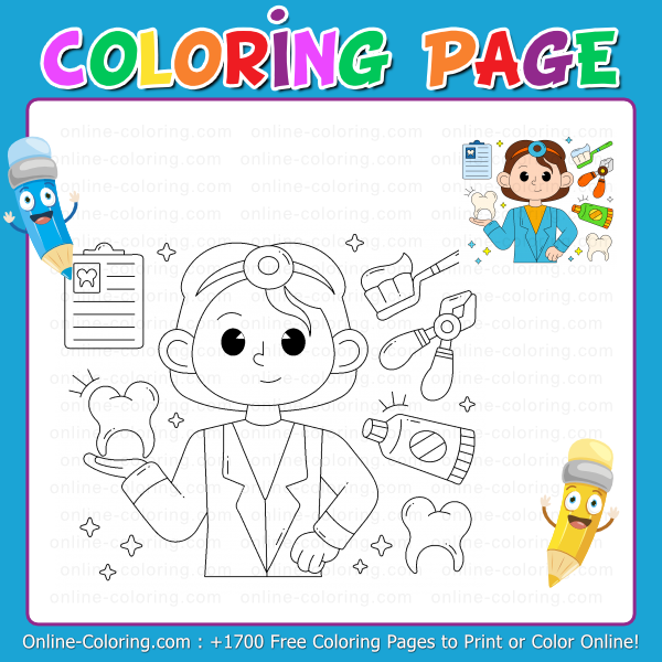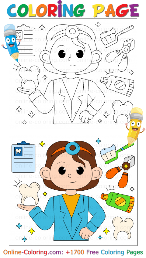This coloring page celebrates a friendly dentist who helps everyone keep their teeth healthy and bright! Around them, you can spot all the important tools for a clean smile: a toothbrush, toothpaste, dental pliers, and a sparkling tooth.