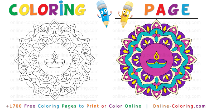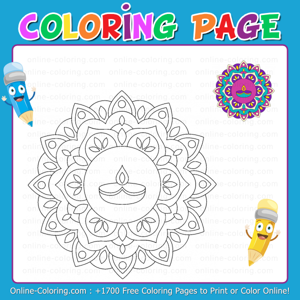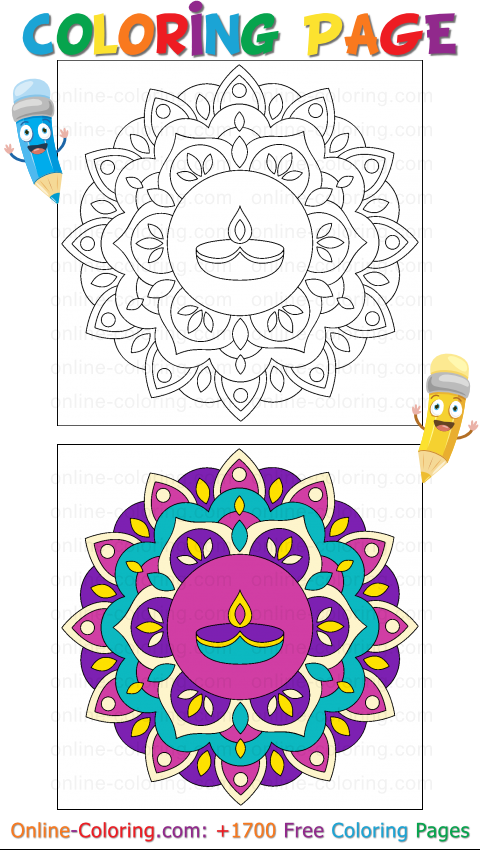 This beautiful coloring page shows a mandala with a diya — a traditional oil lamp — at its center. It represents Diwali, the famous Indian Festival of Lights, which celebrates the victory of light over darkness and good over evil. The flame of the diya stands for wisdom, purity, and hope.