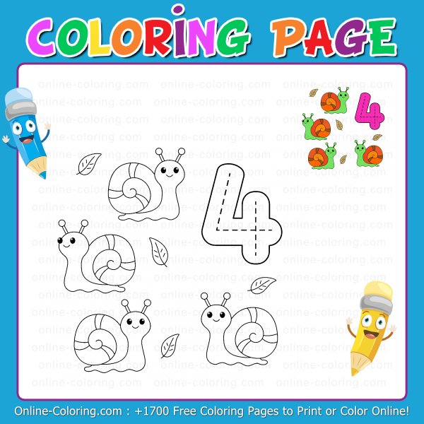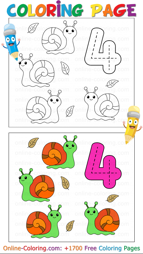Grab your crayons and have fun filling in this page: with number 4 and its snails, you'll discover that numbers can also take a slow little walk in nature!"