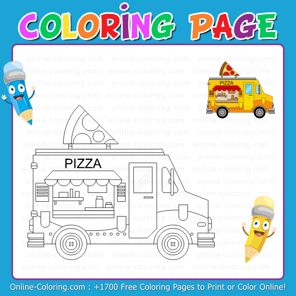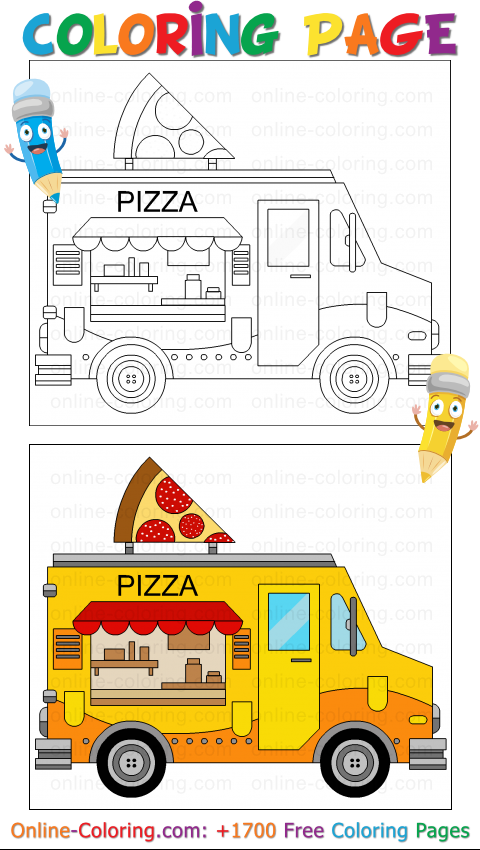 Benvenuto, little artist! Here comes the most passionate pizza truck in town, ready to make your crayons dance like real pizza dough spinning in the air! Look at that giant slice on the roof—it's already calling out to hungry fans with melting cheese, singing tomato sauce, and the aroma of spices bursting like fireworks.