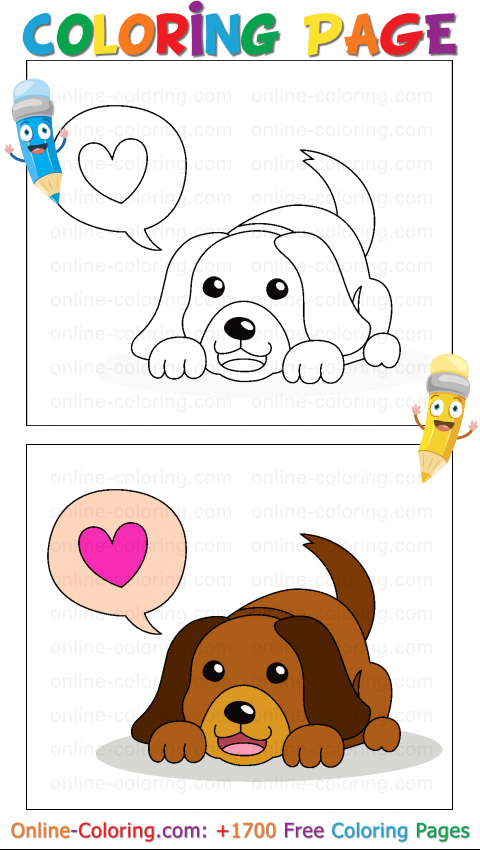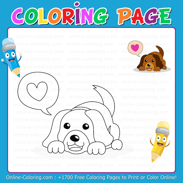 Here's a little coloring page that's sure to make you smile at first glance! Lying on the floor with his front paws stretched out and his tail ready to wag, this playful puppy is waiting for you with sparkling eyes and a cheeky grin. He doesn't need words to show his love—a cute heart floats inside his thought bubble, like a silent message full of affection. It looks like he's about to pounce on you for a cuddle or start a game of hide-and-seek behind the couch. He's curious, playful, a little mischievous... and absolutely adorable!