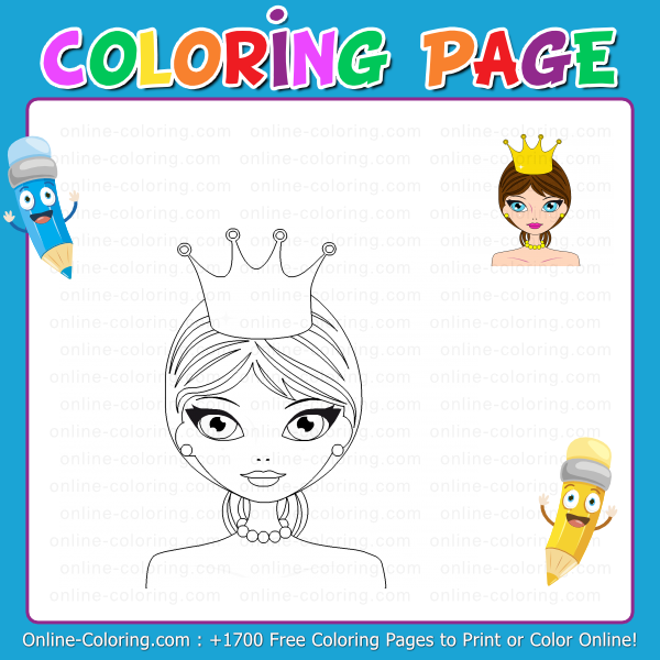 To color this illustration, you might choose to give the crown a bright golden yellow or a sunny yellow that will immediately catch the eye. Her hair could be shaded in chocolate brown, golden blond, or even deep black to enhance her royal aura. Her eyes, true mirrors of her soul, could shine in lagoon blue, emerald green, or warm hazel. Her lips would look beautiful in raspberry pink, cherry red, or soft coral, adding a lively touch to her face. Her skin could take on a soft peach tone or light beige, gently warmed with a hint of rosy blush on the cheeks. The pearls of her necklace and earrings could sparkle in pearly white, pale gold, or even bright silver. Finally, you could play with pastel or vivid accents on the shadows and highlights to give this coloring page all the magic and grace it deserves.