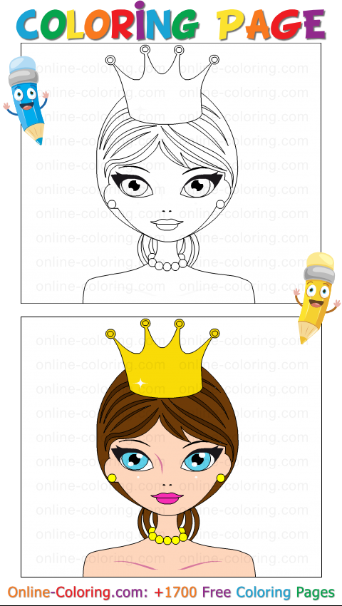 Here is an elegant princess gazing at you with a gentle smile, as if she has just stepped out of a wonderful fairy tale. Her large crown rests proudly on her head, shining with splendor and majesty, like a ray of sunlight frozen in gold. Her eyes, wide and bright, seem to hide palace secrets and dreams of adventures in enchanted gardens. Her hair is perfectly styled, framing her face with grace, and her jewelry sparkles like stars around the moon. You can almost imagine her standing on the balcony of her castle, looking out toward the horizon, ready to greet her people with kindness. This coloring page invites you to dive into a world of refinement and sweetness, where every detail matters to bring to life the queen or princess you imagine.