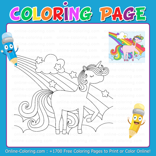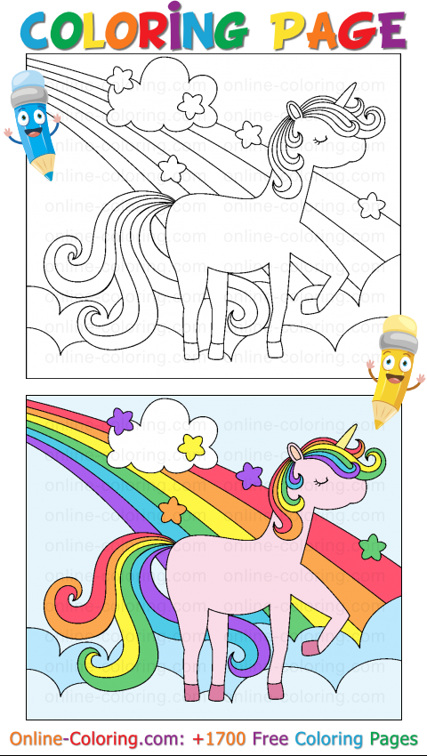 In this magical coloring page, you can bring this unicorn and her wonderful world to life with your favorite colors. Her body can be shaded in a soft candy pink, while her horn shines with a bright golden yellow. Her curly mane and tailâlike festive ribbonsâcan be filled with cherry red, clementine orange, lemon yellow, mint green, turquoise blue, and blueberry violet, just like a real enchanted rainbow. The stars floating around her can sparkle in different shades, like plum purple, apple green, or mimosa yellow. The rainbow stretches across the sky in the same joyful order as her mane, as if it came straight from the unicorn's own magic. The clouds beneath her hooves can stay fluffy white or take on a very pale blue tint, to capture the light of a quiet morning.