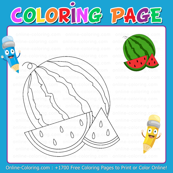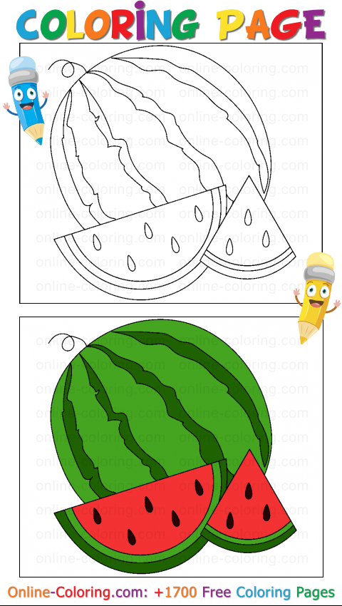 A symbol of freshness and indulgence, watermelon is the star fruit of sunny days. In this coloring page, it reveals itself in all its glory: a whole, perfectly round watermelon, adorned with a green rind striped with darker bands, and two juicy slices showing off their bright red flesh sprinkled with tiny black seeds.